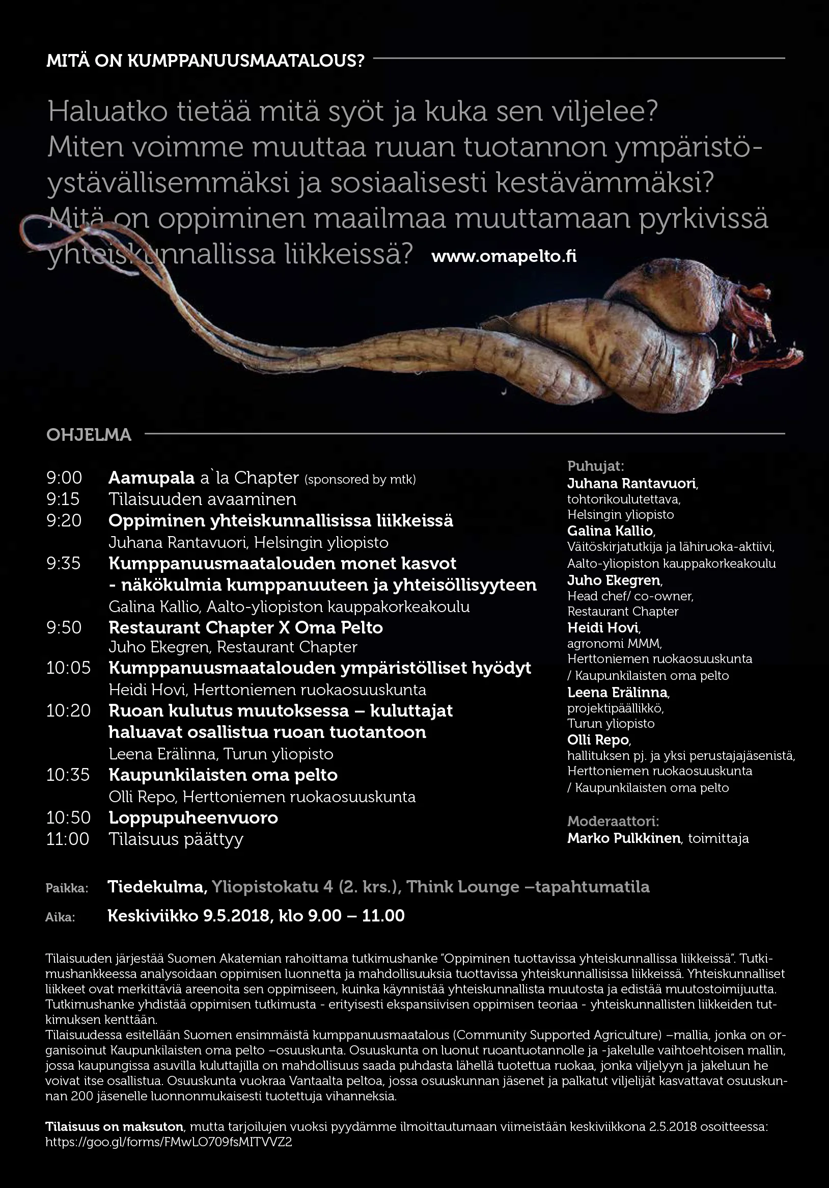 Tilaisuudessa kerromme, miten yhteiskunnallinen aktivismi ja oppiminen liittyvät toisiinsa. Kerromme mitä tarkoittaa kumppanuusmaatalous ja kuinka sitä on Suomessa toteutettu. Tilaisuuden esiintyjinä on sekä ruokaliikkeiden tutkijoita että liikkeissä toimivia aktiiveja.